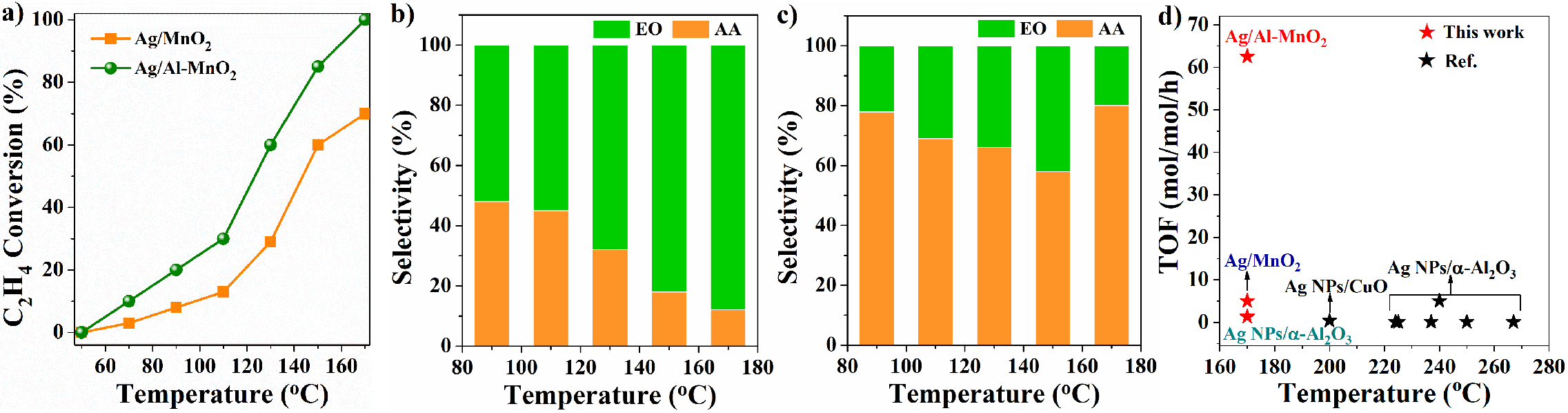 传统乙烯环氧化催化剂Ag负载量高(10wt.%以上),主要通过添加促剂(Cs、Re、Cu、Au)提升环氧乙烷选择性,然而这样往往牺牲了乙烯的转化率。本研究中通过Al修饰的Ag/Al-MnO2催化剂,在较低的Ag负载量条件下(2.5wt.%),实现了常压温和条件的高环氧乙烷产率。本征活性(TOF值)相比于传统Ag NPs/α-Al2O3和未修饰的Ag/MnO2催化剂提高了48倍和13倍。